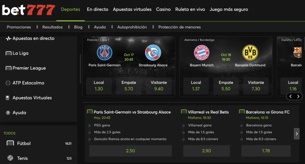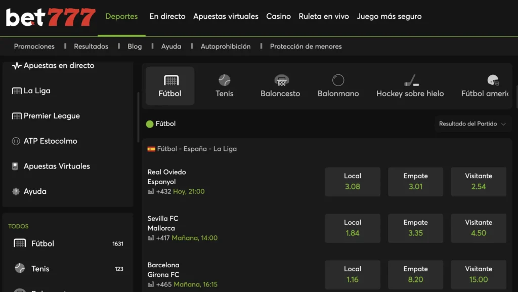 El diseño de la plataforma es muy limpio y accesible, lo que ayuda a encontrar cualquier evento rápidamente. En el Bet 777 menú de la izquierda da acceso a todos los deportes disponibles, y dentro de cada uno de ellos se despliegan los torneos y ligas más importantes.