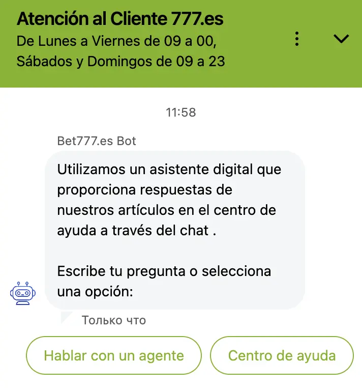 El usuario puede contactar con el servicio de atención al cliente de 777 Bet a través del chat en la propia web, o también por WhatsApp. El horario de atención es de 9:00 a 00:00 horas, de lunes a domingo, y el idioma en que se atenderá es el español.