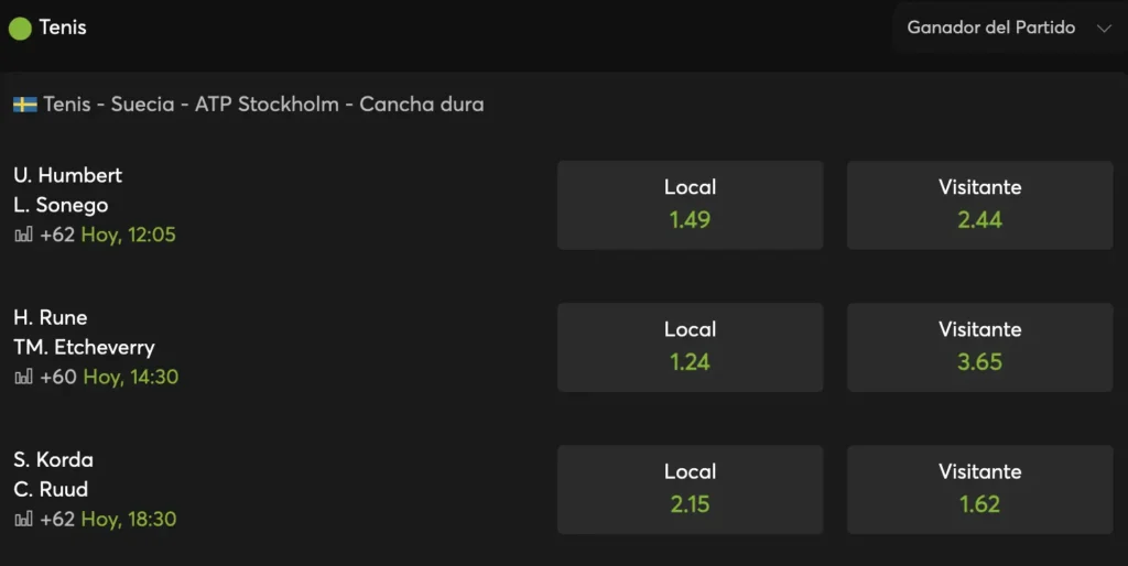 El deporte de la raqueta también está muy presente en Bet777. Aquí encontrarás los partidos más importantes de estrellas como Sinner, Alcaraz o Djokovic, con especial atención a los Grand Slams y los torneos estelares. En esta disciplina es especialmente importante el mercado de handicap, que ofrece una desventaja virtual al favorito para que las cuotas de apuesta sean mucho más interesantes. Podrás apostar tanto en tenis masculino como femenino, en los eventos más populares como Roland Garros y Wimbledon.